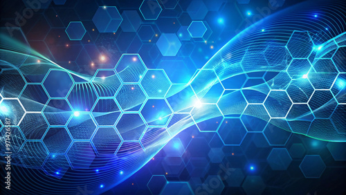 Futuristic hexagonal pattern with glowing blue waves creates modern scientific background. This design evokes sense of innovation and technology