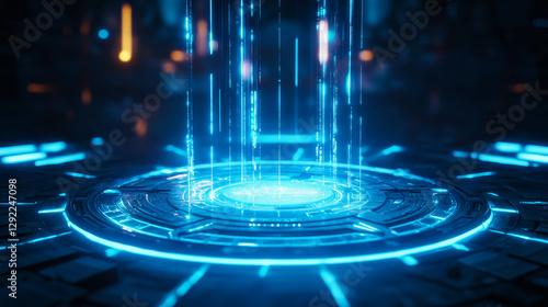 Futuristic hi tech portal with blue neon light glow effect for game ui design. Realistic 3d vector illustration set of cyberpunk teleport platform with hologram beams. Round technology podium.