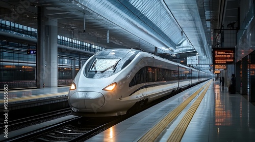 Futuristic high speed train waiting at a sleek contemporary station with passengers boarding for their transit journey Efficient and technologically advanced transportation infrastructure