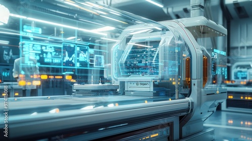Futuristic high tech industrial facility with robotic automation conveyor systems advanced digital controls and integrated data monitoring and analysis to optimize manufacturing logistics and business