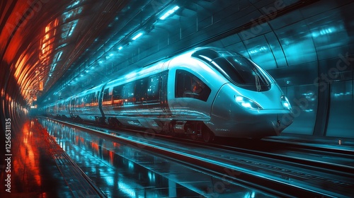 Futuristic high-speed train speeding through a vibrant, neon-lit tunnel