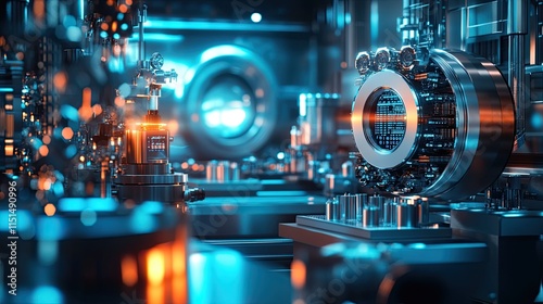 Futuristic high-tech lab with complex machinery and glowing elements.