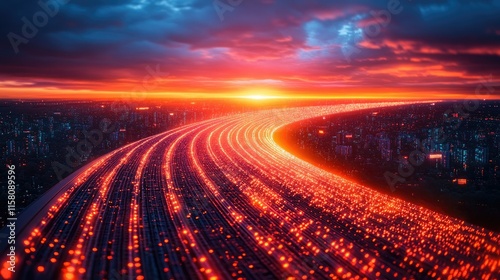 Futuristic highway at sunset, glowing lines curve through city.