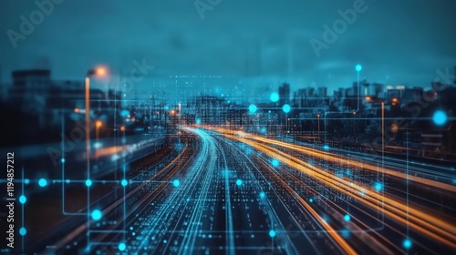 Futuristic highway with data streams and glowing orbs overlaying city landscape