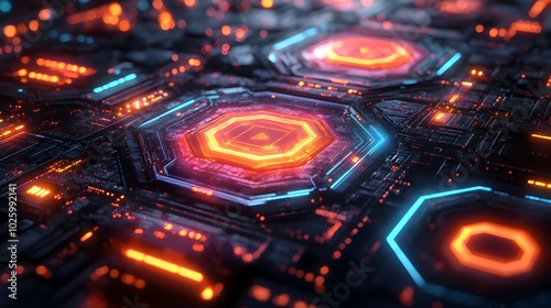 Futuristic Holographic Hexagonal Interface with Glowing Neon Tech Circuitry
