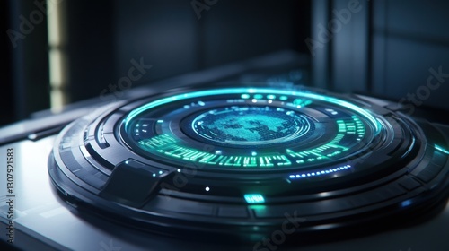 Futuristic holographic interface displaying a digital globe with glowing blue and green accents