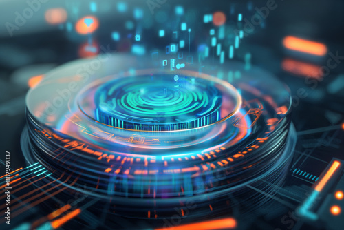 Futuristic holographic technology circular interface with glowing elements and digital circuit. AI and Technology Concepts
