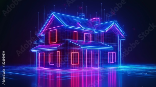 futuristic house with neon outlined walls glowing windows and grid-like structure appearing suspended in cyberspace ideal for sci fi design digital architecture and virtual reality concept visuals