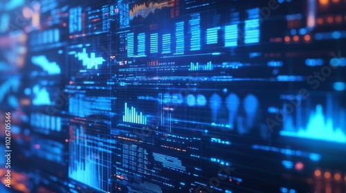 Futuristic HUD display with holographic graphs and data points in bright blue.