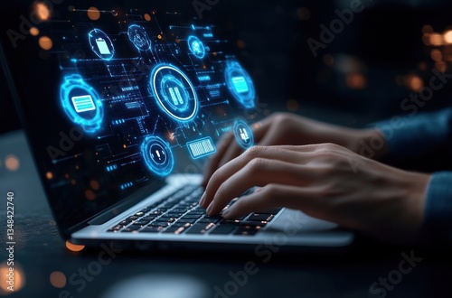 Futuristic Human Computer Interaction with AI Holographic Technology in a Dark Corporate Setting