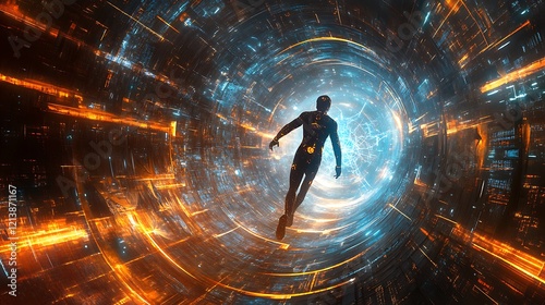 Futuristic human with blue and orange energy forming glowing patterns in a cybernetic world