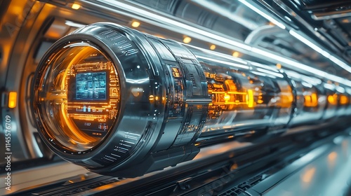 Futuristic Hyperloop Pod with Polished Metallic Finish and Digital Displays Traveling Inside a Transparent Vacuum Tube Rendering of Advanced High Speed Transportation Technology