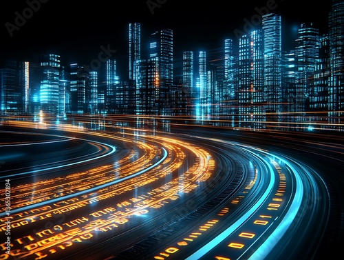 Futuristic Illuminated Cityscape With Digital Data Highway At Night