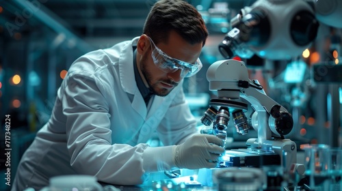 Futuristic image of a scientist working with advanced AI and robotics, cutting-edge lab environment, pioneering and visionary