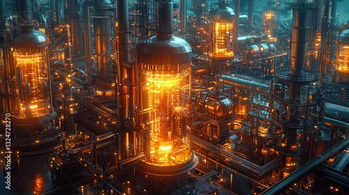 Futuristic industrial complex illuminated with glowing structures and piping networks