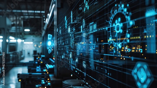 Futuristic industrial technology interface with digital graphic elements and automation in a modern factory setting.