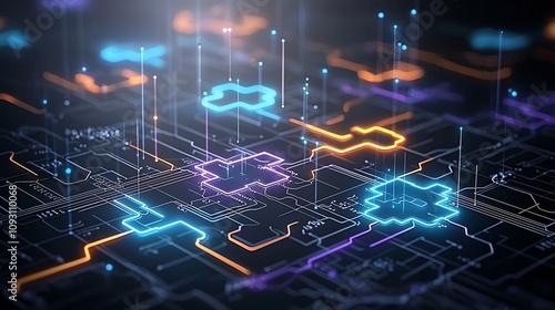 Futuristic interconnected puzzle pieces glowing in vibrant neon blue orange and purple colors with circuit like details and a high tech digital abstract background