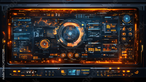 Futuristic interface displaying complex data visualizations and analytics with glowing orange and blue elements, conveying high tech and advanced business environment