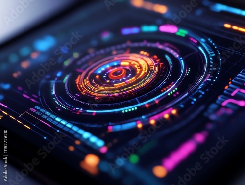 Futuristic interface, glowing holographic dashboard, vibrant neon elements, 3D illustration