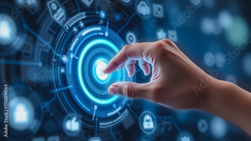 Futuristic Interface Interaction, A close-up shot of a hand reaching out to touch a glowing button on a complex digital interface.