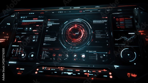 Futuristic interface screen displays data; dark background; control panel; sci-fi technology; user interface