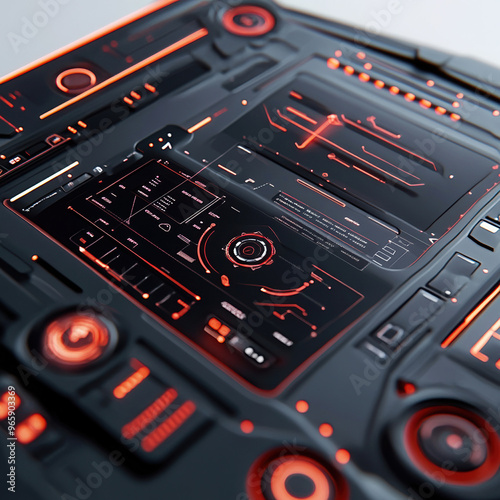 futuristic interface technology dashboard controls digital electronics red accents user interface modern design sci-fi aesthetic software interface abstract design high-tech