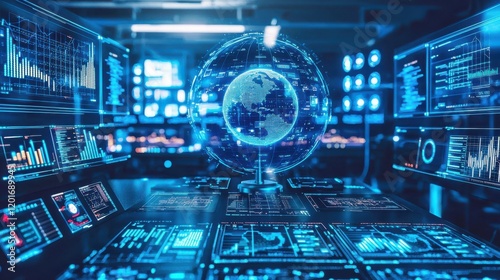 Futuristic Interface with Digital Globes, Data Screens, and Global Connectivity Illustration for Technology Themes