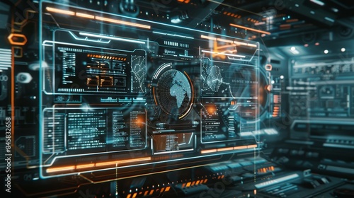 Futuristic Interface with World Map Display - A futuristic interface with a world map display and other data visualizations, creating a sense of technological advancement.