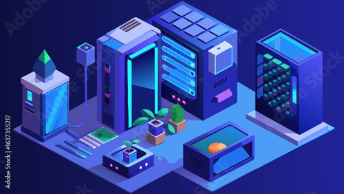 Futuristic isometric data center with glowing servers and lush greenery under neon lights