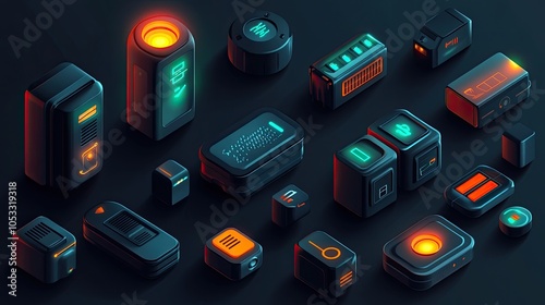 Futuristic isometric interface elements with glowing lights and a dark background.