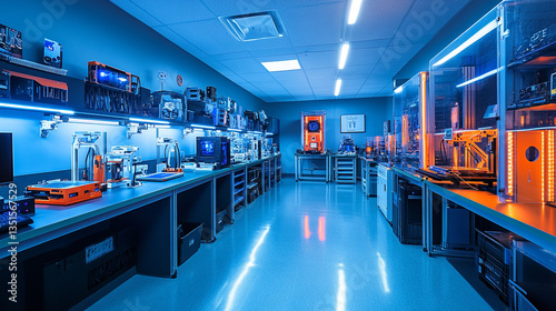 Futuristic Lab: An ultra-modern laboratory bathed in cool blue light, showcasing advanced technology, sleek workstations, and innovative equipment, symbolizing progress and discovery.