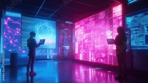 futuristic laboratory bathed in colorful holographic lights showcasing researchers interacting with glowing augmented