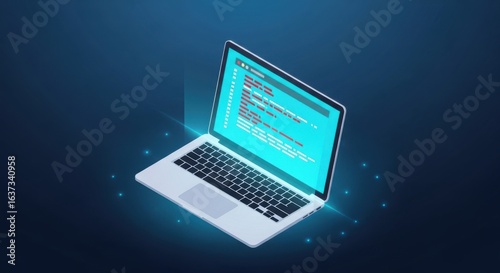 Futuristic laptop displaying code on a blue technological landscape illustration