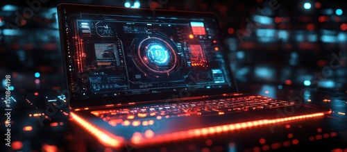Futuristic laptop with glowing screen and keyboard in a dark cyber space setting.