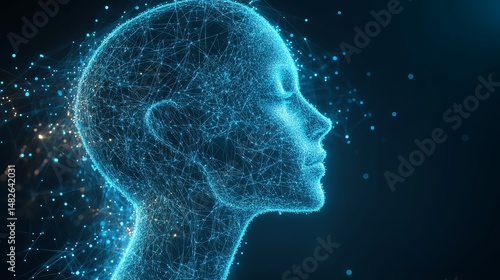 Futuristic Light Blue Digital Human Head in Profile – AI Particle Network, Deep Blue Background & Technological Intelligence Concept Art