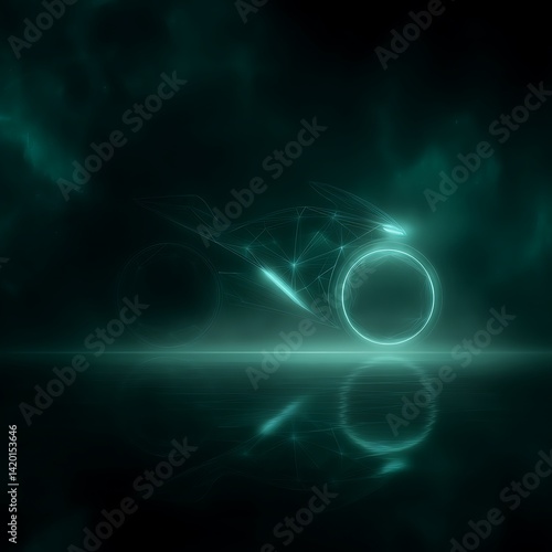 Futuristic Light Cycle Reflection on Dark Surface in Virtual Space with Glowing Teal Blue Hues.