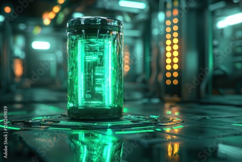Futuristic lithium-ion battery glowing with green neon, representing advanced energy solutions.
