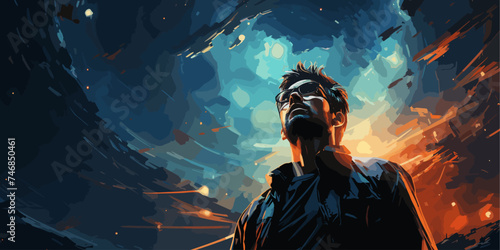 futuristic man standing and looking at the sky with a strange beam of light., digital art style, illustration painting