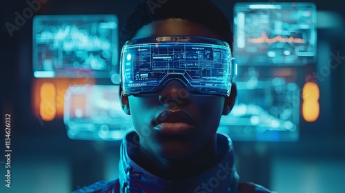 Futuristic Man Wearing Virtual Reality Headset Analyzing Digital Data and Information in Holographic Interface