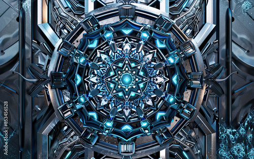Futuristic mandala with sleek geometric patterns, cool blues and silvers, neon accents on metallic.