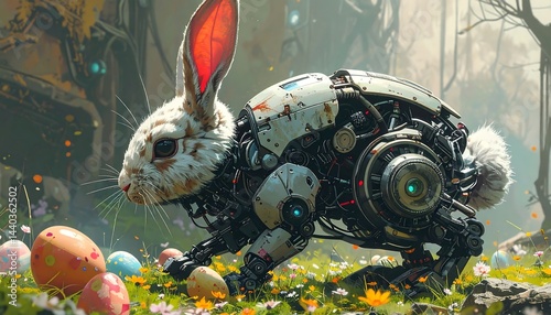 Futuristic Mechanical Rabbit Exploring a Colorful Landscape with Easter Eggs and Vibrant Flora