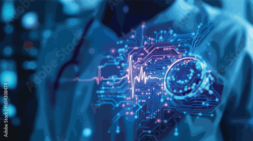 Futuristic medical illustration of healthcare technology with circuit board and pulse wave.