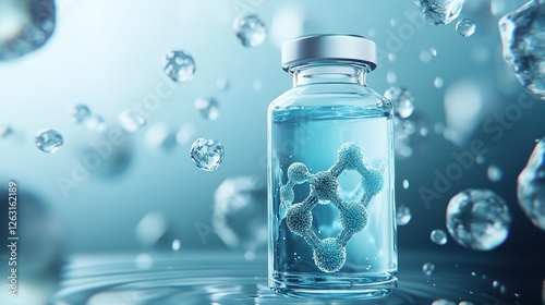 Futuristic Medical Serum Bottle Floating Amidst DNA Structures and Carbon Molecules. High-Resolution 3D Rendering with Light Blue Tones, Water Droplets, and Cinematic Effects for Advanced Biotechnolog