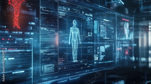 Futuristic medical technology showcasing electronic records on a high-tech interface, representing healthcare innovation.