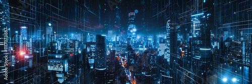 Futuristic metropolis at night with glowing holograms and advanced surveillance systems