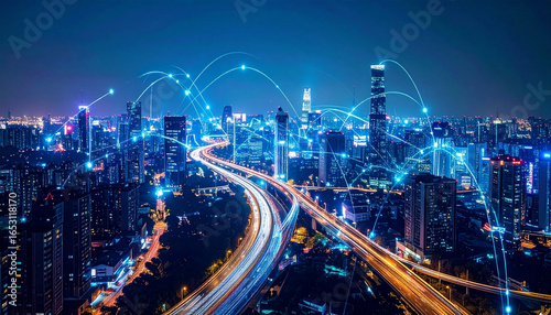Futuristic Metropolis at Night with High-Speed Data Connections, Illuminated Cityscape with Technological Network Visualization Overlay