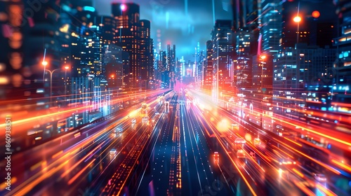 Futuristic Metropolis Glowing with Digital Data Dynamism at Night