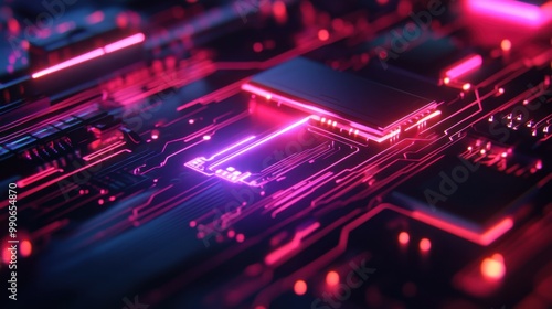 Futuristic microchip design with neon data streams flowing across intricate circuit patterns symbolizing advanced information technology