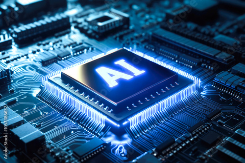 Futuristic microchip technology with ai circuit board in glowing blue light