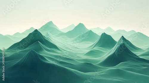 Futuristic mountain landscape with abstract dark green peaks and soft, light green gradient backgrounds, blending natural beauty with modern design.